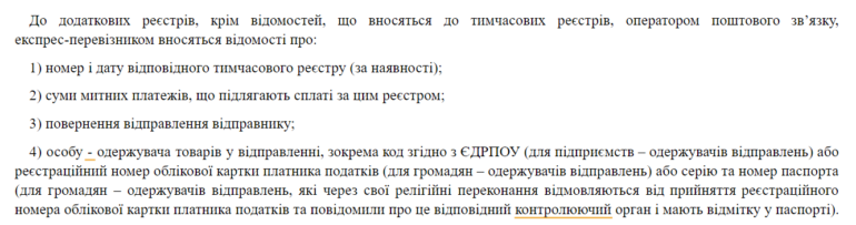 Цієї правкою передбачено, що всі одержувачі міжнародних експрес та поштових відправлень мають обов’язково зазначати інформацію про так званий ідентифікаційний код одержувачів відправлень або серію та номер паспорта. Автори законопроєкту покладають цей обов’язок на експрес-перевізників та поштових операторів — раніше з критикою проти цієї норми виступили ключові оператори, включно з «Нова пошта», «Укрпошта» та DHL Express Ukraine. У «Новій пошті» стверджували, що сама правка не узгоджується із законодавством України про захист персональних даних і призведе до скупчення тисяч відправлень на складах перевізників після того, як значна кількість одержувачів просто відмовиться надавати свій ідентифікаційний код або паспорт.