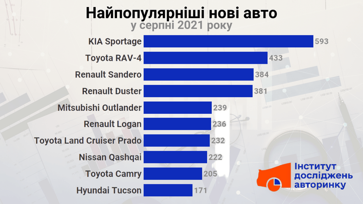 Найбільше в переліку найпопулярніших моделей нових легковиків у серпні 2021 року піднявся Hyundai Tucson — одразу на 3 позиції, з 10 на сьому. Nissan Qashqai та Toyota Camry опустилися на один пункт донизу.