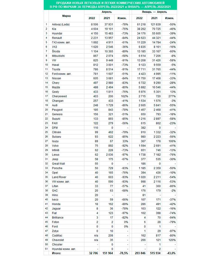 У квітні 2022 року в росії було продано 32 706 нових легкових та легких комерційних автомобілів, що на 78,5% менше у порівнянні з тим самим місяцем минулого року.