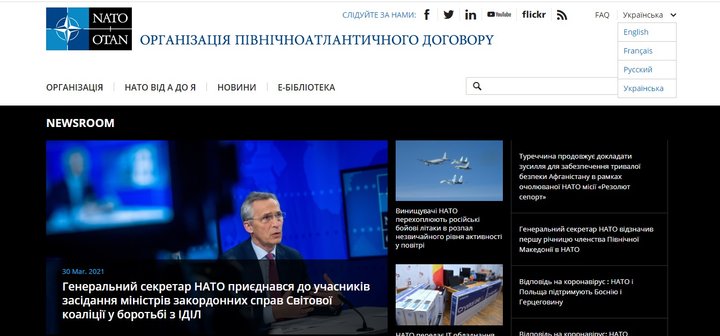 На сайті НАТО додали українську версію. Зміни ввели 6 квітня. До того ж 5 квітня в фейсбуці й твіттері альянсу з’явилися повідомлення українською мовою.