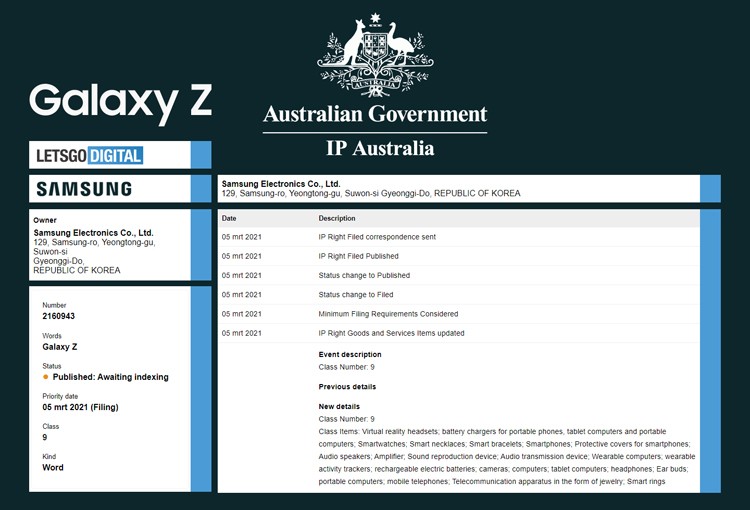 Компанія Samsung, за інформацією ресурсу LetsGoDigital, подала заявки на реєстрацію торгової марки Galaxy Z: документи оприлюднені на сайтах Відомства Європейського союзу з інтелектуальної власності (European Union Intellectual Property Office, EUIPO) і Агентства з інтелектуальної власності Австралії (IP Australia).