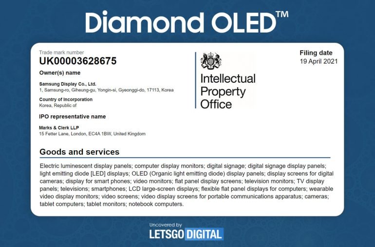 19 квітня 2021 року Samsung Display подала у Відомство інтелектуальної власності Великобританії (UK IPO) документи для реєстрації торгової марки Diamond OLED, яка відноситься до 9 класу пристроїв. Торгова марка може використовуватися для моніторів, дисплеїв для смартфонів, телевізорів, планшетів і так далі.