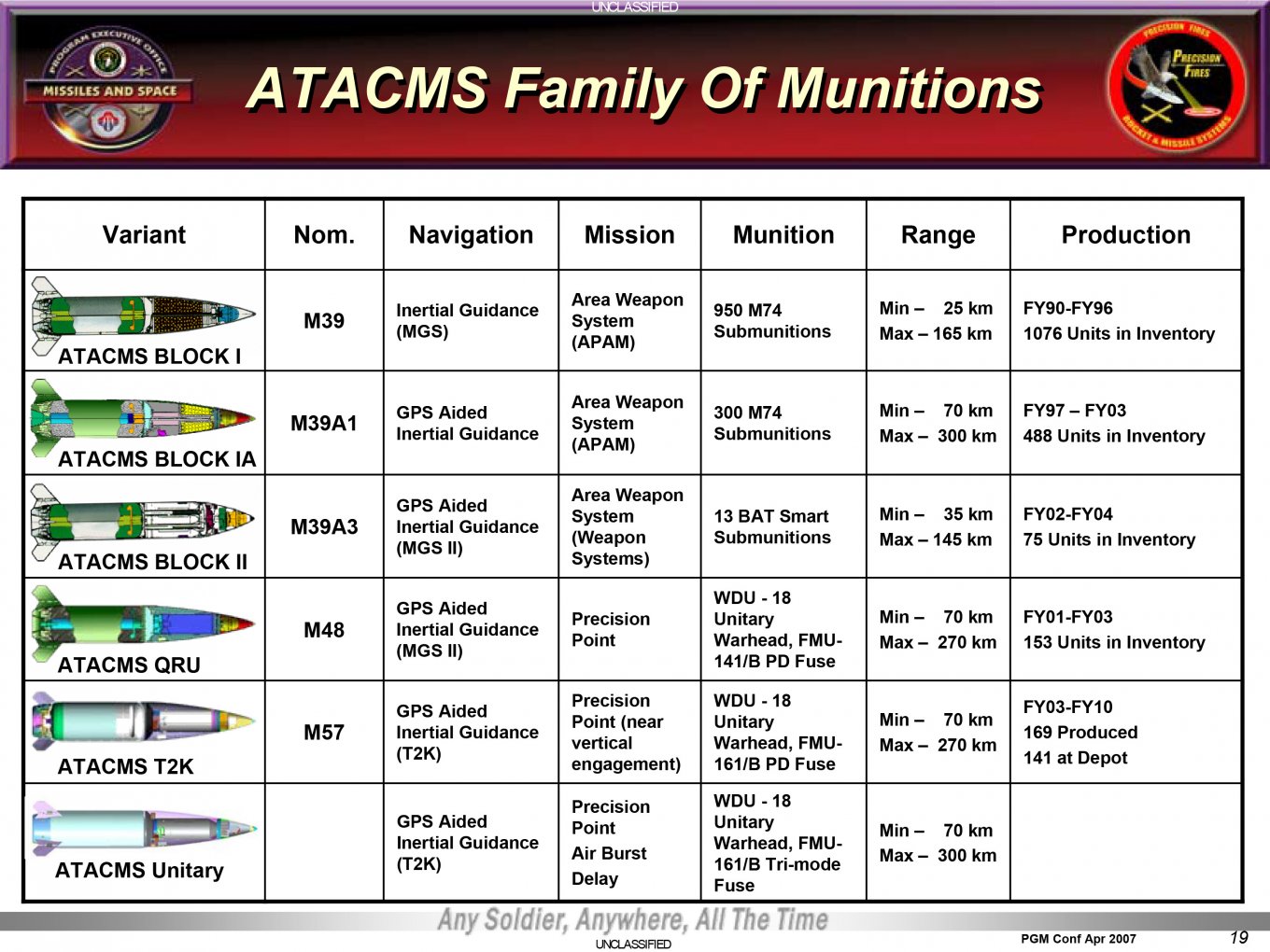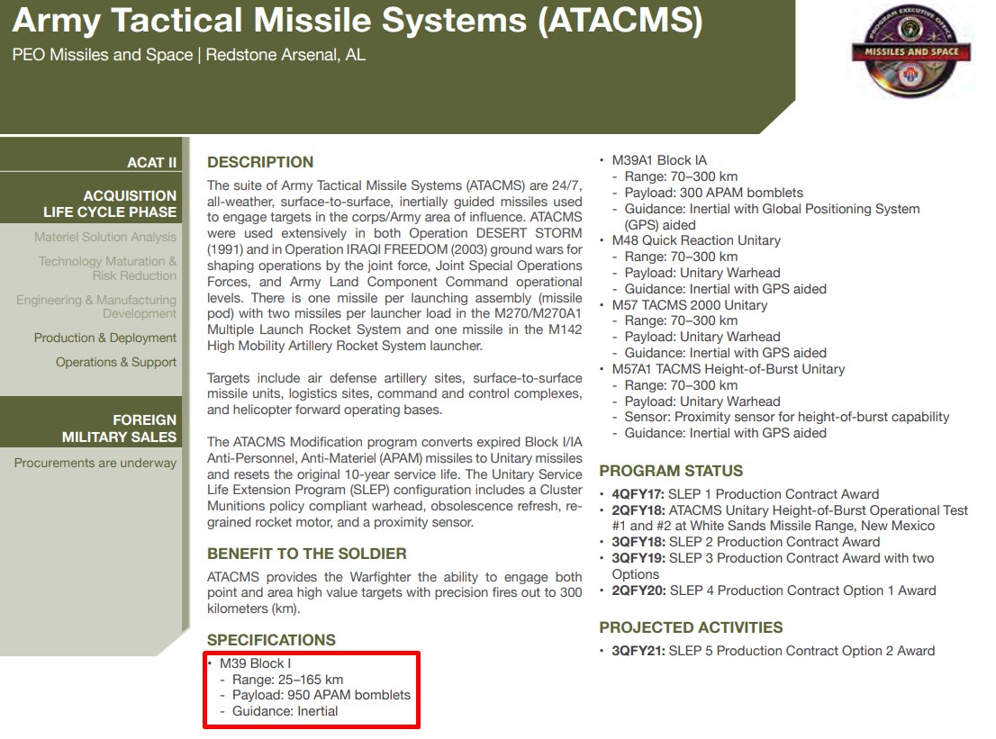 Дальність M39 (ATACMS Block I, MGM-140A) складає 165 км. І немає жодного пояснення, чому у мережі та деяких ЗМІ активно шириться інформація про дальність у 128 км. Зрештою наводимо данні з Weapon Systems Handbook армії США: