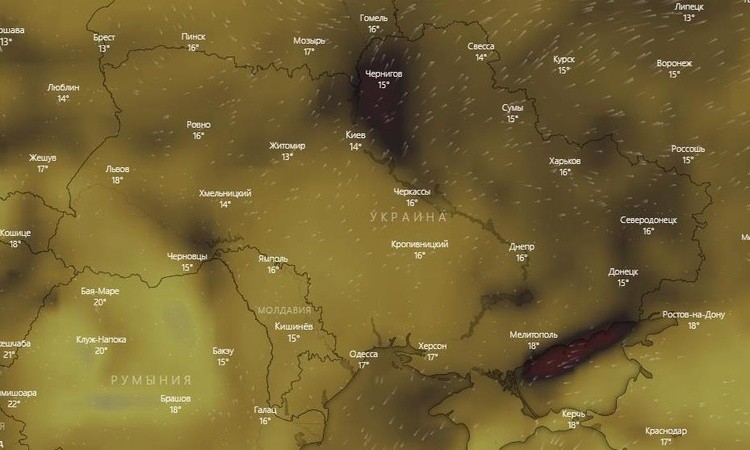 За даними Windy, 23 жовтня підвищений рівень концентрації СО спостерігався в Київській, Чернігівській та Черкаській областях, а також над Азовським морем (біля Маріуполя і Мелітополя).