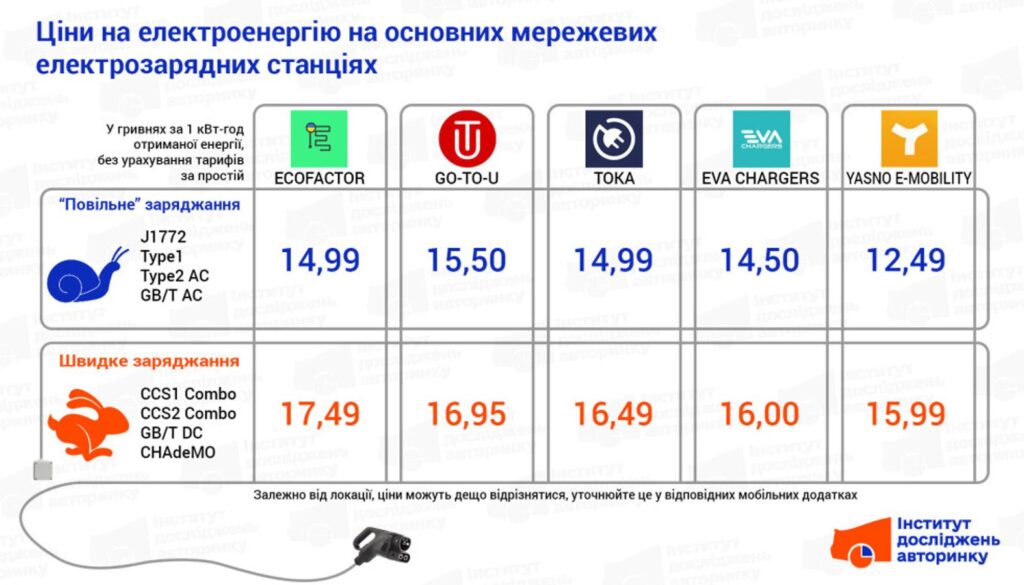 Скільки потрібно заплатити за кіловат електроенергії на чарджерах з публічним доступом? Фахівці Інституту досліджень авторинку зібрали інформацію з мобільних додатків провідних операторів мережевих ЕЗС в Україні та вибрали ті значення цін, які найчастіше повторювалися.
