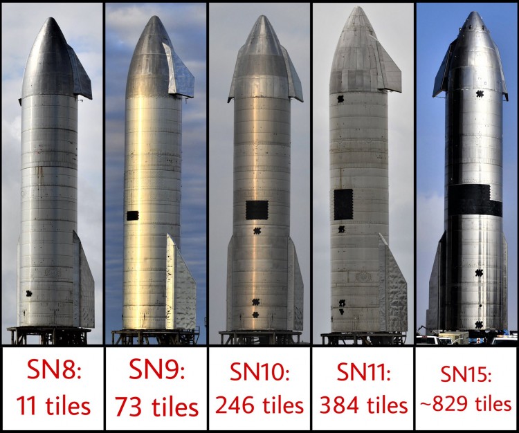 До речі, починаючи з SN8 SpaceX поступово збільшує кількість плиток теплозахисного екрану — він покликаний запобігти руйнуванню корабля при нагріванні під час входу в атмосферу Землі. Клеяться плитки поки ще вручну, але якщо на SN8 їх було всього 11, то на SN15, як підрахували ентузіасти, — вже більше 800: