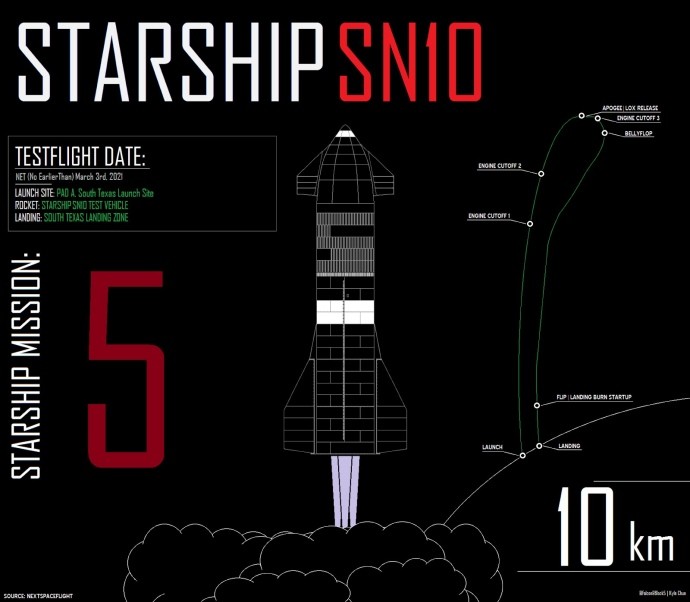 Як і в випадку попередніх випробувань, основним завданням польоту SN10 було не досягнення максимальної висоти, а випробування ключових систем ракети. Вона злітала на всіх трьох двигунах Raptor і потім по одному відключала їх у міру досягнення верхньої точки траєкторії. Потім SN10 виконала маневр перевороту в горизонтальне положення для керованого спуску за допомогою закрилків при вільному падінні в атмосфері. У фінальній частині випробувань ракета була повернута у вертикальне положення, включила гальмування двигунами та м’яко приземлилася.