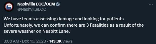 Губернатор штату Теннессі Біл Лі виступив із заявою у Twitter (X), заявивши, що він з дружиною моляться за жителів штату, які постраждали від торнадо.