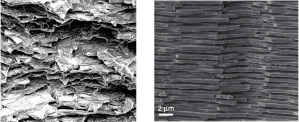 Вчені вивчали структуру внутрішнього прошарку раковини молюска Abalone, щоб спробувати відтворити її у лабораторії. На основі цього був створений матеріал зі скла та акрилу. Архітектура скла імітує структуру мушлі, що й забезпечує високі показники міцності.