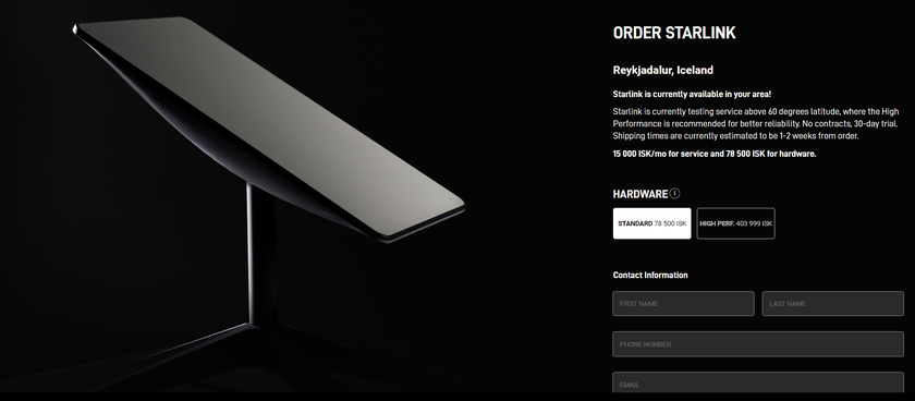 Жителі Ісландії вже можуть оформити замовлення на офіційному сайті Starlink. Вартість обладнання становить $555. Пакет High Performance коштує $2860. Щомісячна плата за тариф становить $105.