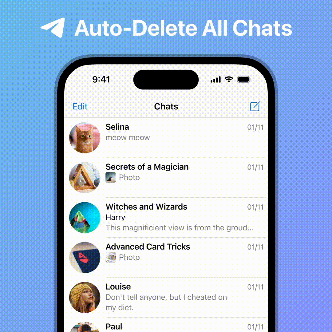Крім цього, Telegram отримав функцію автоматичного видалення чатів. Користувачам доступний загальний таймер, за яким будуть автоматично видалятися повідомлення у всіх нових чатах. Активувати функцію можна в налаштуваннях.