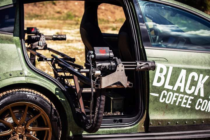 Кузов автомобіля затягнули у плівку з камуфляжним патерном, а також прикрасили деталями, які зазвичай можна зустріти на військовій техніці. У багажнику електричного кросовера змонтовано повноцінну кав’ярню. У передньому багажнику – холодильну камеру для льоду, щоб робити фрапе та інші прохолодні напої. Та головною принадою цього Model X, поз сумнівом, є пара мініганів калібру 5.56, встановлених за передніми кріслами. Так, кулемети справжні!