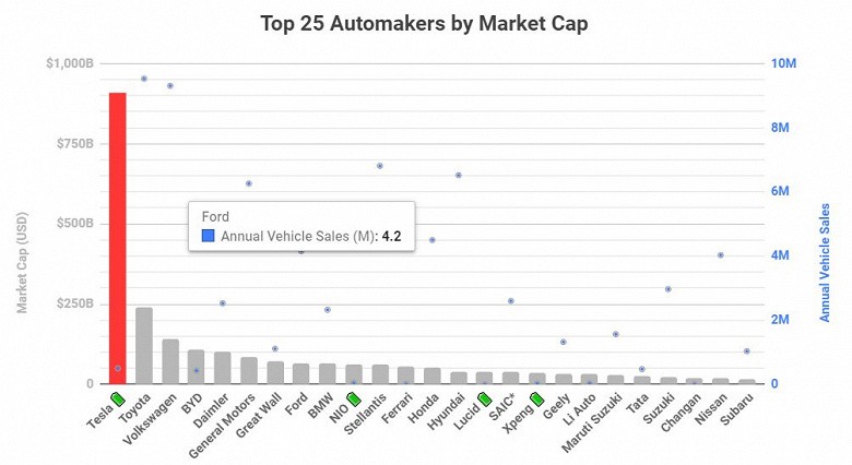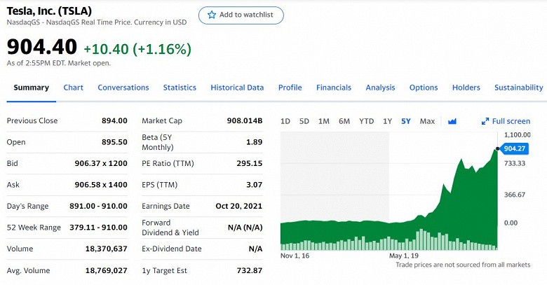 Так день акції Tesla додали в ціні 10 доларів і пішли за психологічну позначку в 900 доларів. Такими дорогими вони не були ніколи. В результаті ринкова капіталізація Tesla перевищила позначку в 908 мільярдів доларів.
