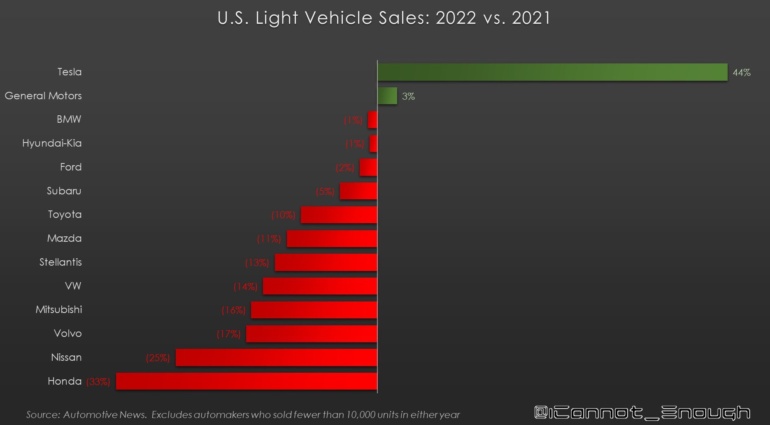 У 2022 році Tesla відвантажила клієнтам 1,3 млн авто — на 40,3% більше результату 2021 року і це чи не найкращі темпи росту у всій автомобільній індустрії. Водночас Tesla трішки не дотягнула до цільових 50%, зокрема й через уповільнення попиту та економічний спад. Окрім того, конкуренція посилюється, особливо в Китаї — у 2022 році китайська BYD продала вдвічі більше електромобілів на акумуляторах, ніж Tesla (911 тис. проти 439 тис.). На початку року Tesla знизила ціни в Китаї — окремі моделі стали на 40% дешевші, ніж в США. Що іронічно, цей прайс-кат спричинив масові протести в Китаї, та зрештою Tesla відмовилася виплачувати компенсації незадоволеним покупцям, які здійснили покупку до зниження цін. І ось зараз автомобілі Tesla подешевшали в Європі та щобільше, це відчутніше в США — нові ціни можна побачити в онлайн конфігураторі на сайті компанії.
