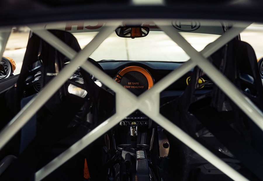 На місці основного дисплея – панель з вуглепластику. На центральній консолі з’явилися блок органів управління сигнальними лампами, а також важелі перемикання передач і ручного гальма. Дверні панелі виготовлені з карбону, а замість класичних дверних ручок використовуються легкі тканинні стропи. Зрозуміло, передбачений і обов’язковий для подібних змагань каркас безпеки.