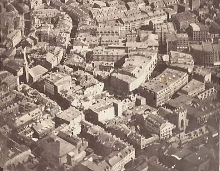 Бостон, 1860 рік. Це найстаріша зі збережених фотографія, знята з висоти пташиного польоту. Її зробив американець Джеймс Уоллас Блек 13 жовтня 1860 року, піднявшись на аеростаті на висоту 630 метрів. На цьому знімку видно дві історичні пам’ятки: Стара південна церква, побудована в неоготичному стилі, і первісна церква Трійці, яка незабаром буде зруйнована великою бостонскою пожежею в 1872 році і потім заново відбудована.