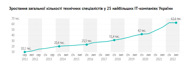 У січні загальна кількість ІТ-спеціалістів у топ-50 вперше сягнула 100 тисяч, але в першому півріччі вона зменшилася на 3%, і станом на кінець липня у 50 найбільших компаніях України працює 97,6 тисячі фахівців. У першому півріччі 2022 року майже у половини зменшився штат. Водночас клькість спеціалістів у топ-25 компаній зменшилася на 800 осіб — нині там працює 77 тисяч фахівців.
