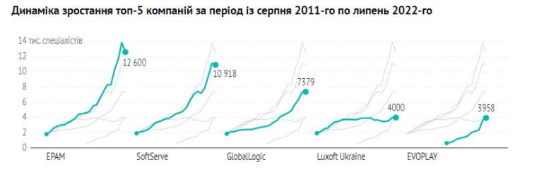 Відбулися зміни й у «великій п’ятірці» — Ciklum вперше за 10 років опинився за межами п’яти найбільших компаній, а її місце посіла Evoplay. Остання вперше потрапила до п’ятірки саме завдяки активному зростанню за останній рік (майже на 1,5 тисячі спеціалістів з липня 2021 року). Вже кілька років поспіль EPAM продовжує утримувати статус найбільшої ІТ-компанії України, проте за пів року вона показала найбільший спад (мінус 1260 спеціалістів). Softserve, яка посідає друге місце зі штатом у 10 918 працівників за цей же період втратила 164 спеціалісти. На 3-й і 4-й сходинках — GlobalLogic і Luxoft.