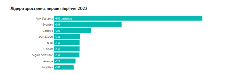 Найактивніше у січні-липні цього року зростала компанія Ajax Systems — на 800 спеціалістів. Можна пригадати, що навесні й влітку Ajax відкривав нові локації як в Україні, так і за кордоном (перший закордонний завод у Туреччині), вийшов на ринок Мексики й Північної Америки. Також активно розширилися Evoplay і Genesis — на 366 і 200 спеціалістів відповідно.