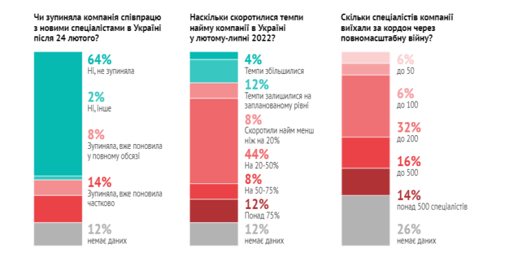 Понад 60% компаній сказали, що не зупиняли наймання в Україні після 24 лютого, але такий же відсоток підтвердив скорочення найму з огляду на довоєнні плани більш ніж на 20% у лютому-липні 2022 року. Скорочення спостерігається серед нетехнічних фахівців, тоді як кількість технічних фахівців у топ-25 навіть трішки збільшилася — майже на 100 осіб.