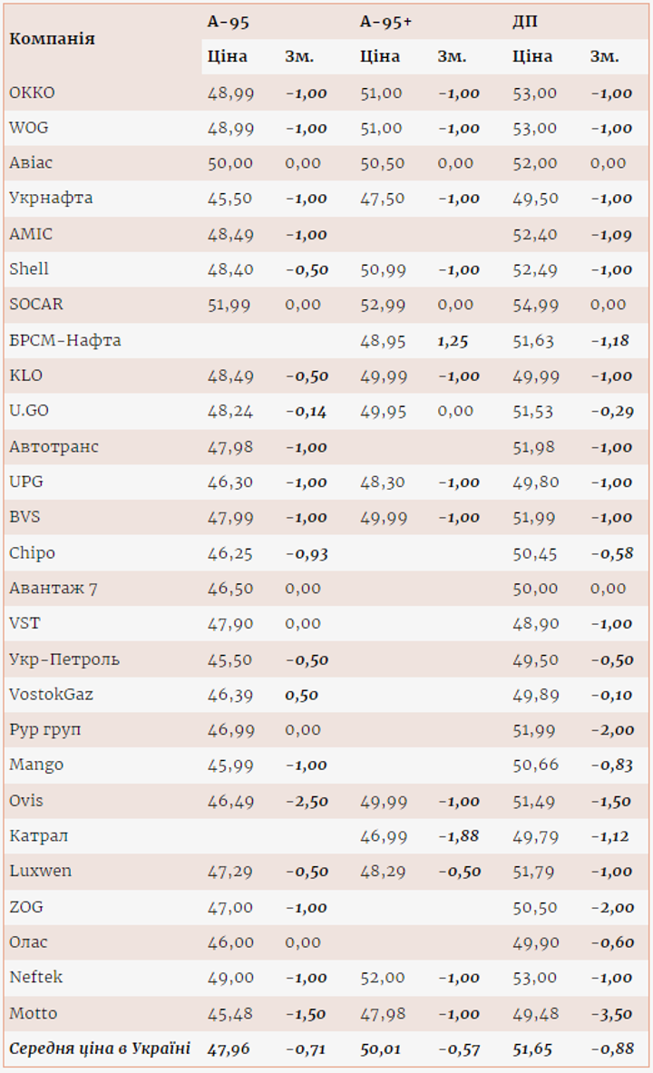 У мережі KLO «п’ятірка плюс» і ДП здешевшали на 1 грн/л, до 49,99 грн/л, стандартна «п’ятірка» – на 50 коп./л, до 48,49 грн/л. Такі мережі, як Shell і UPG знизили ціну всіх видів палива в середньому на 0,5-1 грн/л.