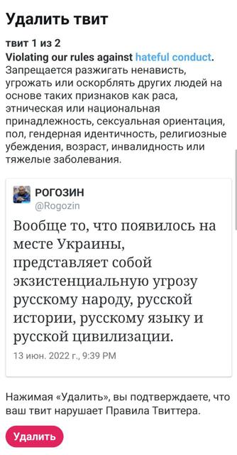 Причина – прогнозована, і це не чергова ахінея на адресу Ілона Маск. Точніше, чергова ахінея, але не на адресу Ілона Маска. Цього разу Рогозін назвав Україну “екзистенційною загрозою росії”. Це він написав 13 червня, а через три дні повідомив, що Twitter обмежила дію його облікового запису за розпалювання ненависті на національному грунті.