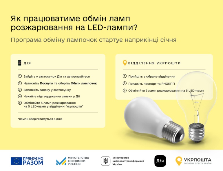 З 30 січня стартувала Всеукраїнська програма зі зниження навантаження на енергетичну систему країни та скорочення дефіциту електроенергії для користувачів, яка передбачає, що кожен українець зможе обміняти 5 старих ламп розжарювання на 5 енергоефективних LED-лампочок.
