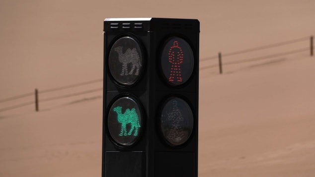 When the traffic signal turns green, camels can cross the road, while tourists cross when the signal turns red, greatly ensuring traffic safety. pic.twitter.com/JZ7VkLDMQx