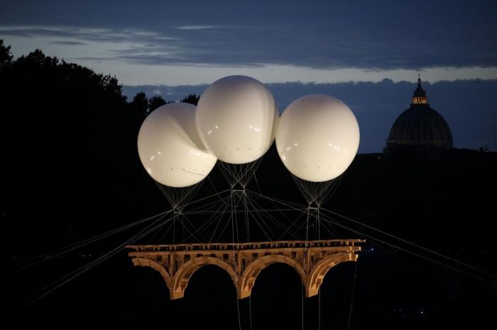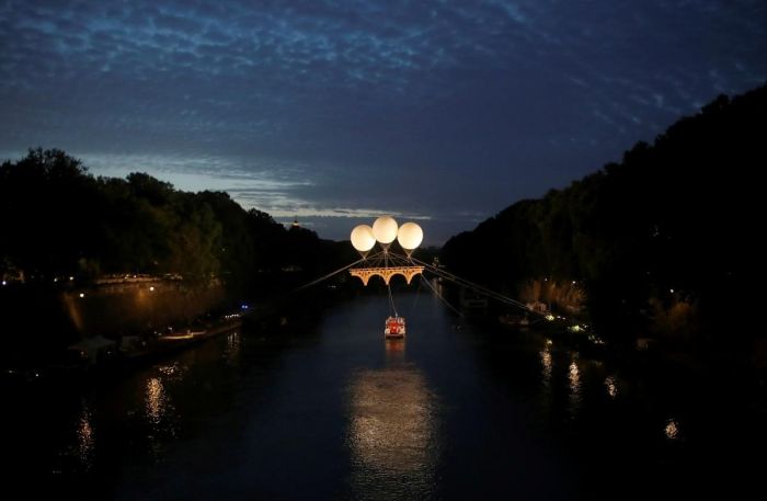 У Римі над річкою Тибр ‘звели’ міст, про який мріяв легендарний Мікеланджело Буонаротті. Це 18-метрова картонна інсталяція, яка висить на трьох наповнених гелієм білих кулях.