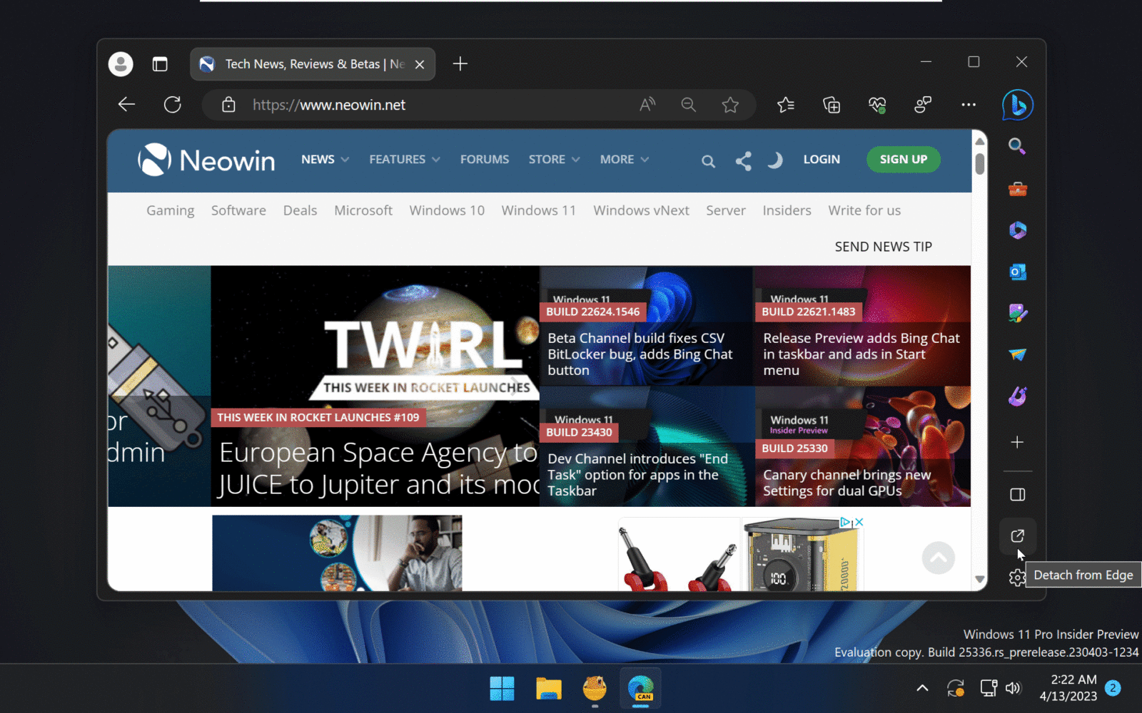 Кілька місяців тому Microsoft представила функцію бічної панелі для свого браузера. Вона дає змогу закріплювати вебсайти та отримувати доступ до різних інструментів, таких як генератор зображень, основні функції браузера, Bing AI, тест швидкості тощо. Бічна панель отримує нові функції, деякі з яких можуть виглядати дещо дивно. Наприклад, останнє оновлення дозволяє від’єднати бічну панель від головного вікна, створивши на робочому столі постійну панель, схожу на звичну Панель завдань, із швидким доступом до закладок.