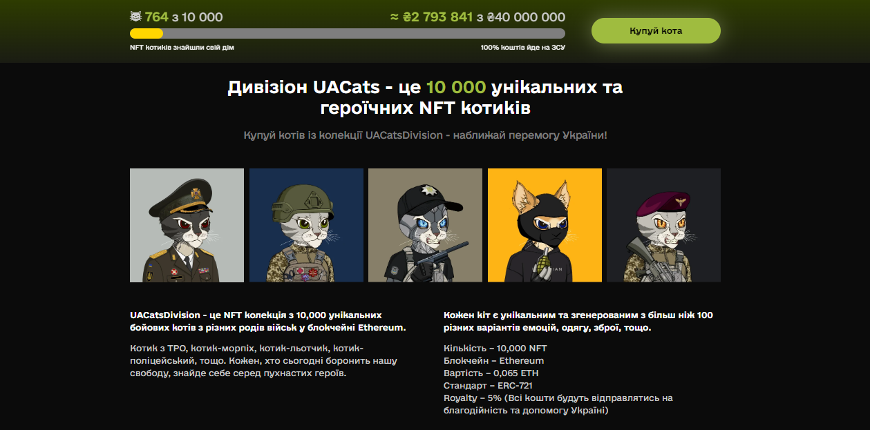 Українські розробники з команди UACatsDivision спільно з фандрейзинговою платформою United24 і виданням Incrypted запустили першу національну NFT-колекцію з котами-героями ЗСУ. Колекція складається з 10 000 різних котів, які символізують захисників України.