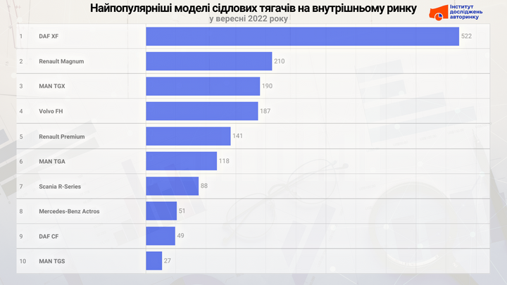 Лідером на українському внутрішньому ринку тягачів став DAF, таких у вересні купили 581 шт. (33,2%). Також популярністю користувалися Renault Trucks (362 шт., 20,7%), MAN (344 шт., 19,7%), Volvo (215 шт., 12,3%) та Scania (118 шт., 6,7%).