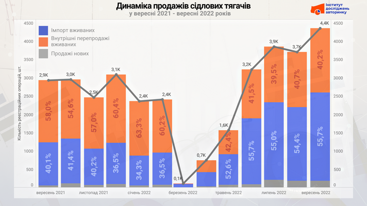 У вересні 2022 року українці придбали 4,4 тисячі нових та вживаних сідлових тягачів. Це на 48,8% більше, ніж за аналогічний період минулого 2021 року та на 17,5% більше, ніж у серпні-2022. Такий показник — рекордний не лише за останні 12 місяців, але й за багато років спостережень за автомобільним ринком України, стверджують експерти Інституту досліджень авторинку.