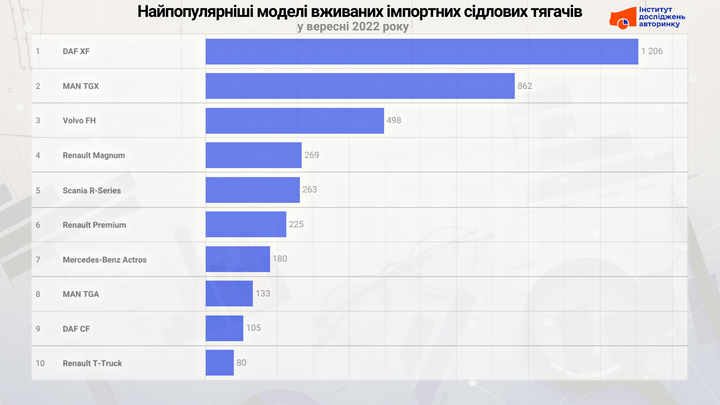 Найбільш популярною моделлю вживаного сідлового тягача на внутрішньому ринку був DAF XF, таких придбали 522 штуки. Другу сходинку рейтингу зайняв Renault Magnum (210 шт.), а третє — MAN — TGX (190 шт.).