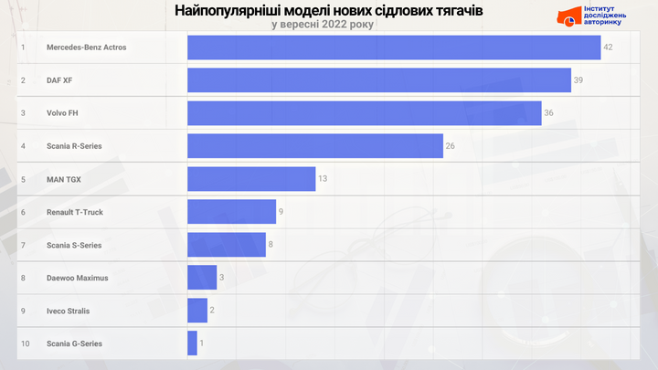 Лідером продажів нових сідлових тягачів став Mercedes-Benz Actros (42 шт.). Друге місце зайняв DAF XF (39 шт.), третє — Volvo FH (36 шт.). Також до першої п’ятірки потрапили Scania R-Series (26 шт.) та MAN TGX (13 шт.).