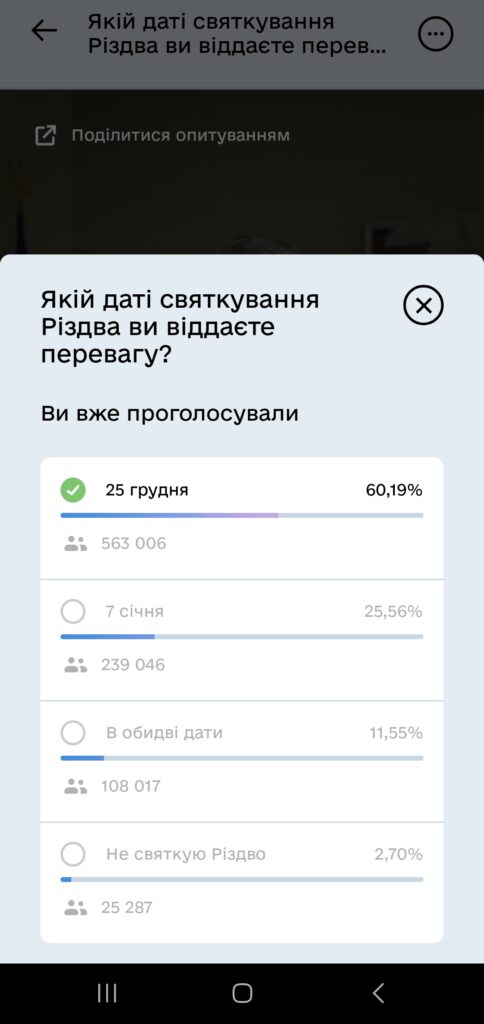 Так в Дії розпочалось опитування серед населення, коли святкувати Різдво. Наразі проголосували майже мільйон українців, і понад 60% висловилось за святкування Різдва 25 грудня.