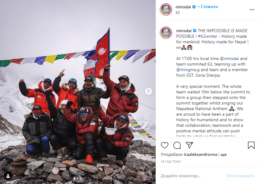 Німсдай Пурджа, один з альпіністів підтвердив взяття гори опублікованими в instagram фото.
