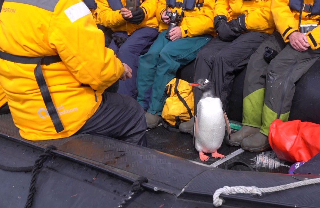 Пінгвін щосили метався між косатки та туристами, а потім спробував застрибнути на один з човнів. Перша спроба виявилася невдалою, проте він спробував ще раз і за допомогою туристів все ж забрався на борт.