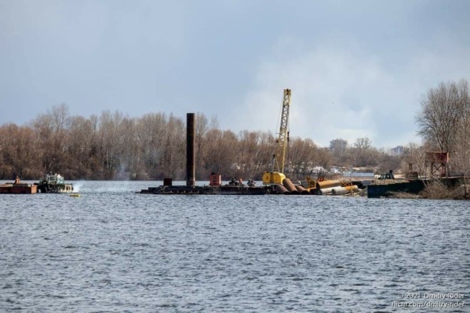 Зазначається, що зараз тут б’ють палі на суші з боку гольф-поля та на воді. Також вже приступили до розчищення території під забивання паль на самому острові.