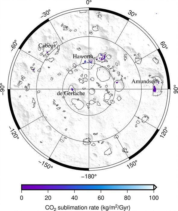 У новому дослідженні, проведеному Планетологічним інститутом США та Каліфорнійським університетом у Лос-Анджелесі, доведено, що в південному полярному регіоні Місяця є ділянки, температура яких дозволяє зберігати вуглекислий газ у замороженому твердому стані. Цей ресурс важливий для майбутніх місячних місій в наступному десятилітті плануються державні та приватні місії на супутник Землі, яким знадобляться місцеві ресурси для облаштування.