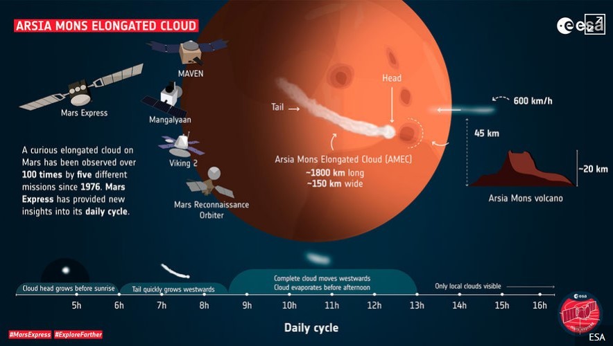 Астрономи провели спостереження за довгою хмарою на Марсі та дізналися, як вона змінюється з плином часу. Виявилося, що вона виникає тільки навесні та влітку в ранні ранкові години, а до полудня випаровується.