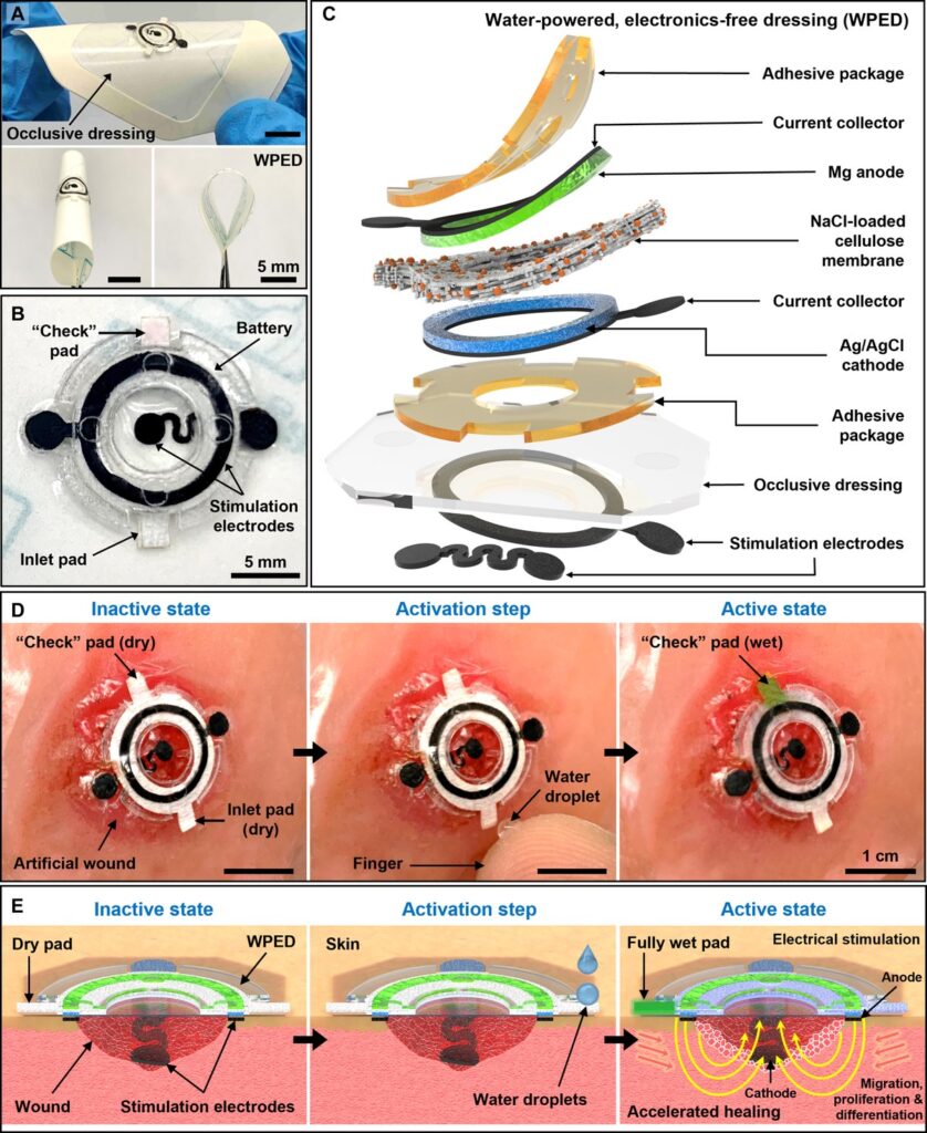 Зокрема, дослідницька група розробила перев’язувальні матеріали на водній основі (WPED), які являють собою одноразові перев’язувальні матеріали, що мають електроди з одного боку та невелику біосумісну батарею — з іншого. Пов’язка накладається на пацієнта так, щоб електроди контактували з раною. Потім на батарейку наносять краплю води, яка активує її. Після активації пов’язка виробляє електричне поле протягом декількох годин.