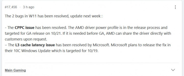 Раніше йшлося про те, що AMD разом з Microsoft розробляють оновлення, які повинні вирішити проблеми повільної кеш-пам’яті 3-го рівня у процесорів Ryzen в середовищі Windows 11, а також налагодити роботу механізму CPPC2. Вчора AMD повідомила, що патч, який виправляє помилки в роботі CPPC2, вийде 21 жовтня. Однак деякі споживачі можуть отримати його раніше. Деталі не вказуються, але, судячи з усього, під цими споживачами компанія має на увазі своїх корпоративних клієнтів. Оновлення, яке розв’яже проблему із затримкою L3-кеша процесорів Ryzen, стане доступним через функцію «Оновлення Windows» вже 19 жовтня.