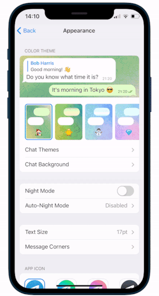 У версії Telegram для iOS з’явилися глобальні теми кольорів — їх можна застосувати для всього додатка, а не тільки для особистих чатів. Кожна тема має денну та нічну версії, використовується кольорові градієнти для блоків повідомлень та анімовані фони з унікальними візерунками.