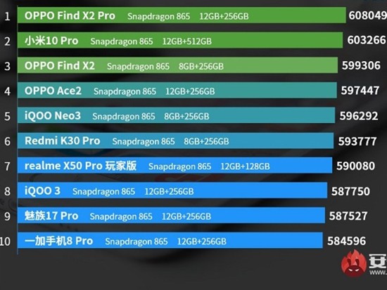 На першому місці влаштувався OPPO Find X2 Pro. Модель без приставки Pro посіла третю сходинку. Між ними розташувався Xiaomi Mi 10 Pro. Перші два смартфона в списку заробили понад 600 000 балів. Третє місце зупинилося в кроці від цієї позначки. Не вистачило лише 694 бали.