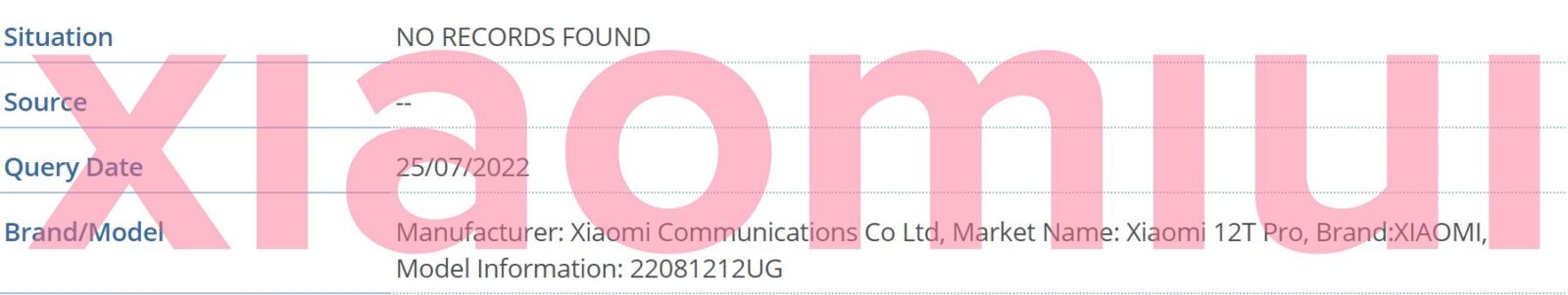 Xiaomi має намір представити нового учасника серії Xiaomi 12T. Йдеться про Xiaomi 12T Pro, який з’явився у базі даних IMEI під назвою моделі «22081212UG».