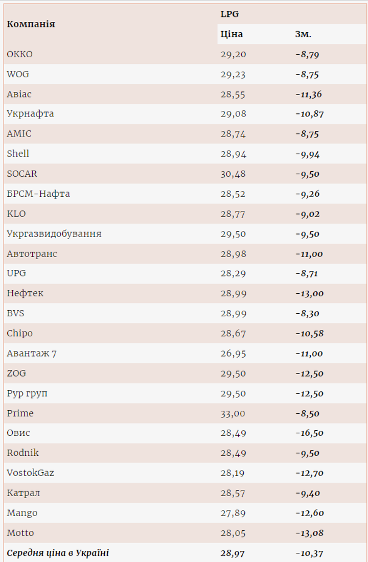 На станціях ОККО і WOG автогаз здешевшав на 8,79 грн/л і 8,75 грн/л, до 29,20 і 29,23 грн/л відповідно.
