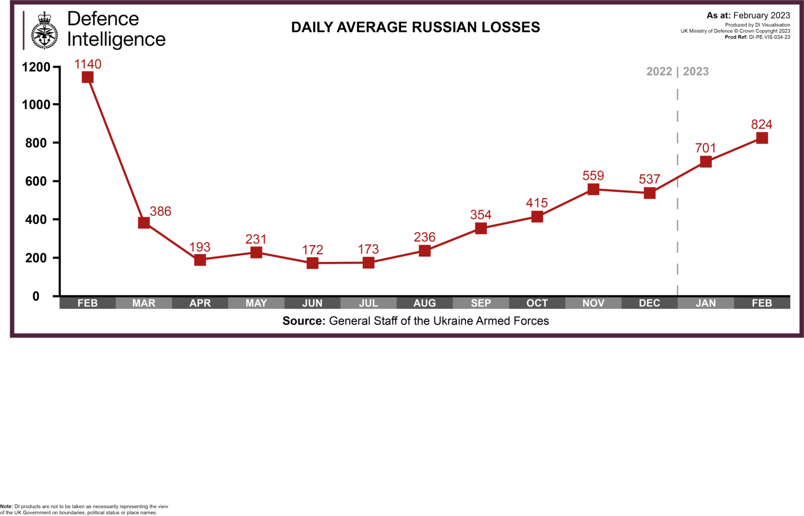 “Генштаб ЗСУ регулярно оприлюднює щоденну статистику втрат росіян. Британська військова розвідка не може перевірити українську методологію, тенденції, які ілюструють дані, ймовірно, точні. Середній показник за останні сім днів становив 824 жертви на день, що вчетверо перевищує показники за червень-липень 2022 року”, – зазначили аналітики з Британії.