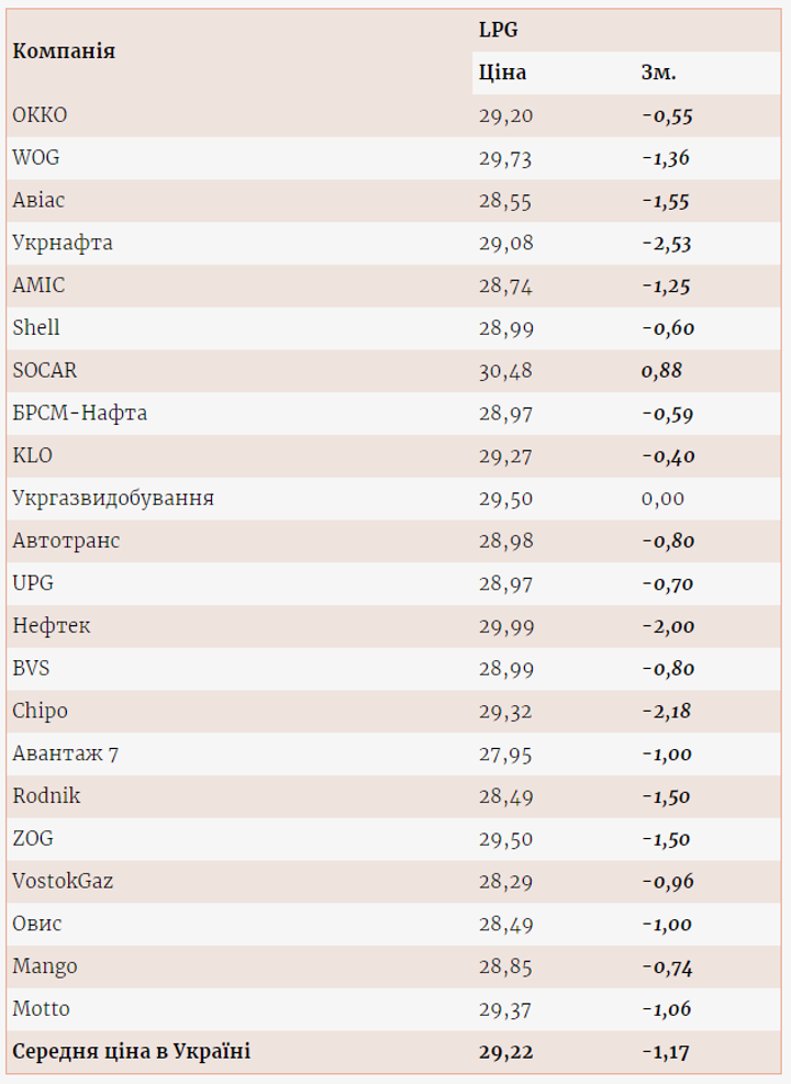 На станціях ОККО і WOG автогаз здешевшав на 0,55 грн/л і 1,36 грн/л, до 29,20 і 29,73 грн/л відповідно.