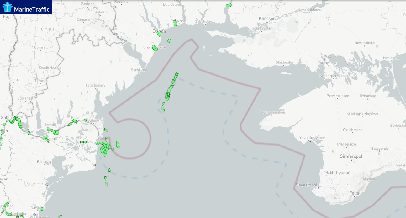 Онлайн сервіс відстеження судів MarineTraffic демонструє, що одразу 20 балкерів та інших цивільних суден рухається визначеним гуманітарним коридором і вже вийшли за межі територіальних вод України.